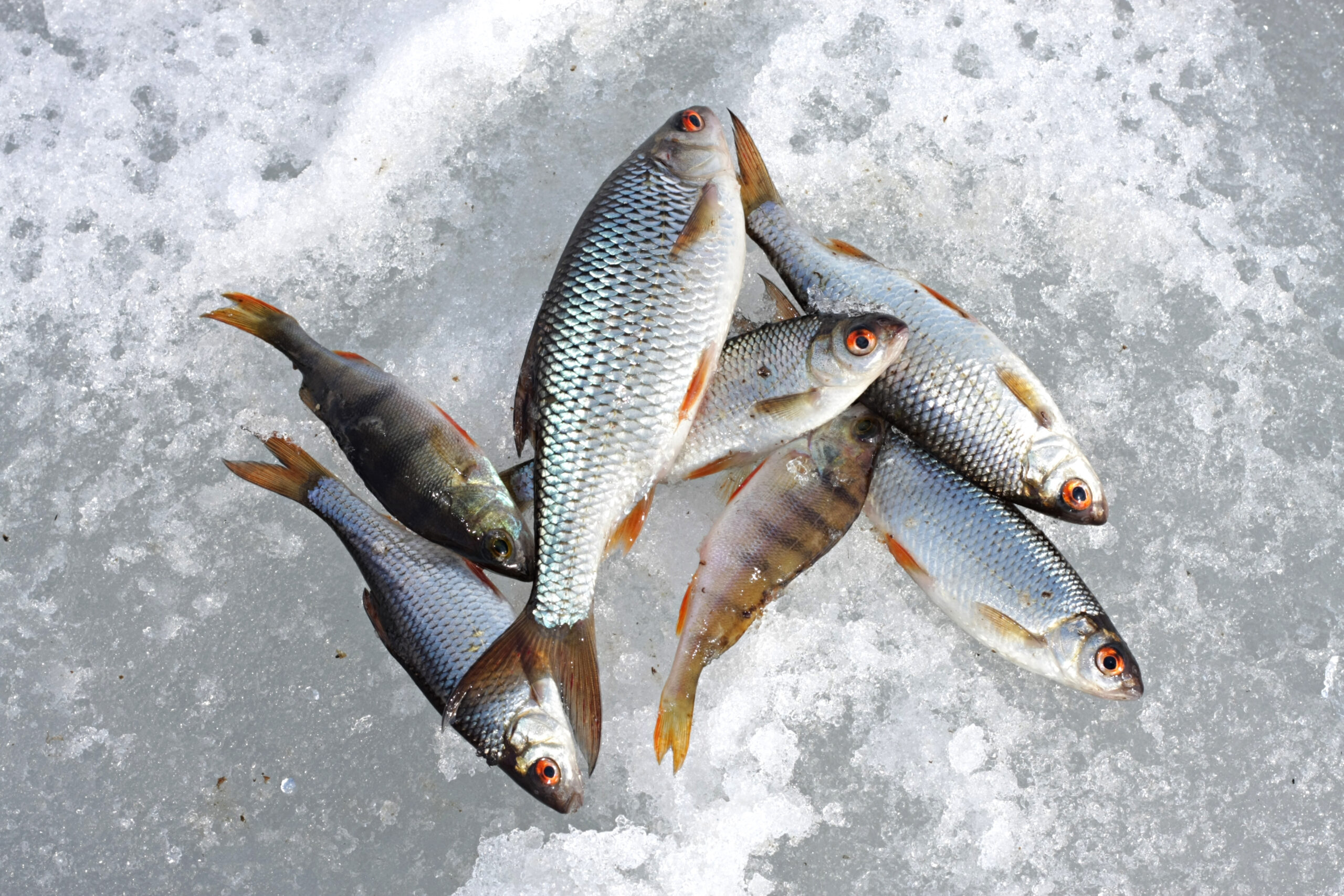 River fish lies on snow. Winter fishing